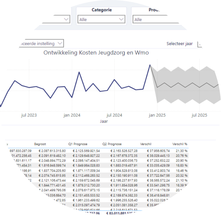 • Inzicht op maat: onze specialisten integreren een krachtige analysetool in jouw bestaande of nieuwe Power BI-dashboards, waarmee je trends, toekomstprognoses en beleidsimpact eenvoudig inzichtelijk maakt.